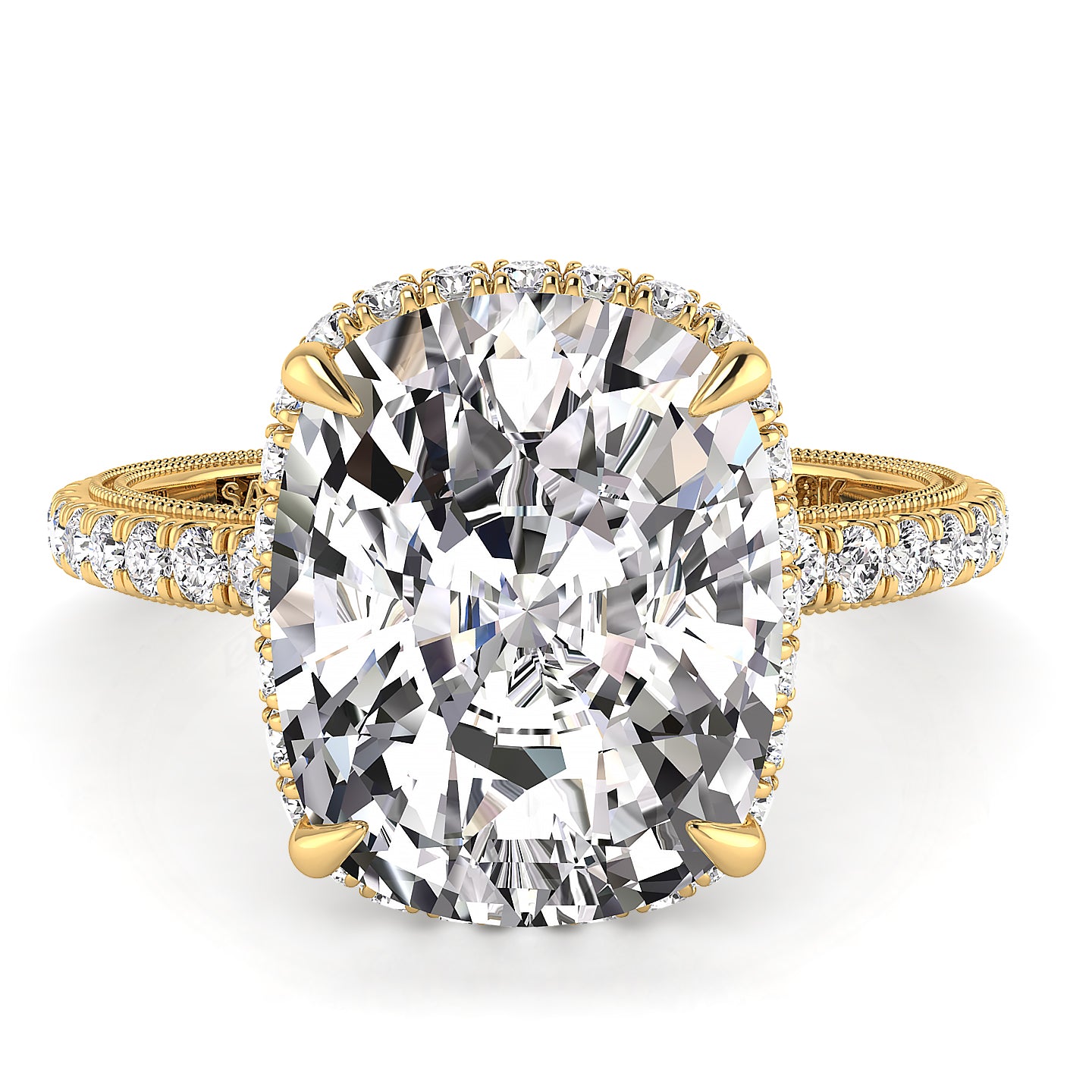 Milgrain Shank Cushion engagement rings feature a classic cushion-cut center stone set on a vintage-inspired band with intricate milgrain detailing. These rings offer timeless elegance and exceptional sparkle, perfect for brides seeking a unique and romantic style. Discover the beauty of cushion engagement rings with milgrain shank designs that blend tradition and modern allure.