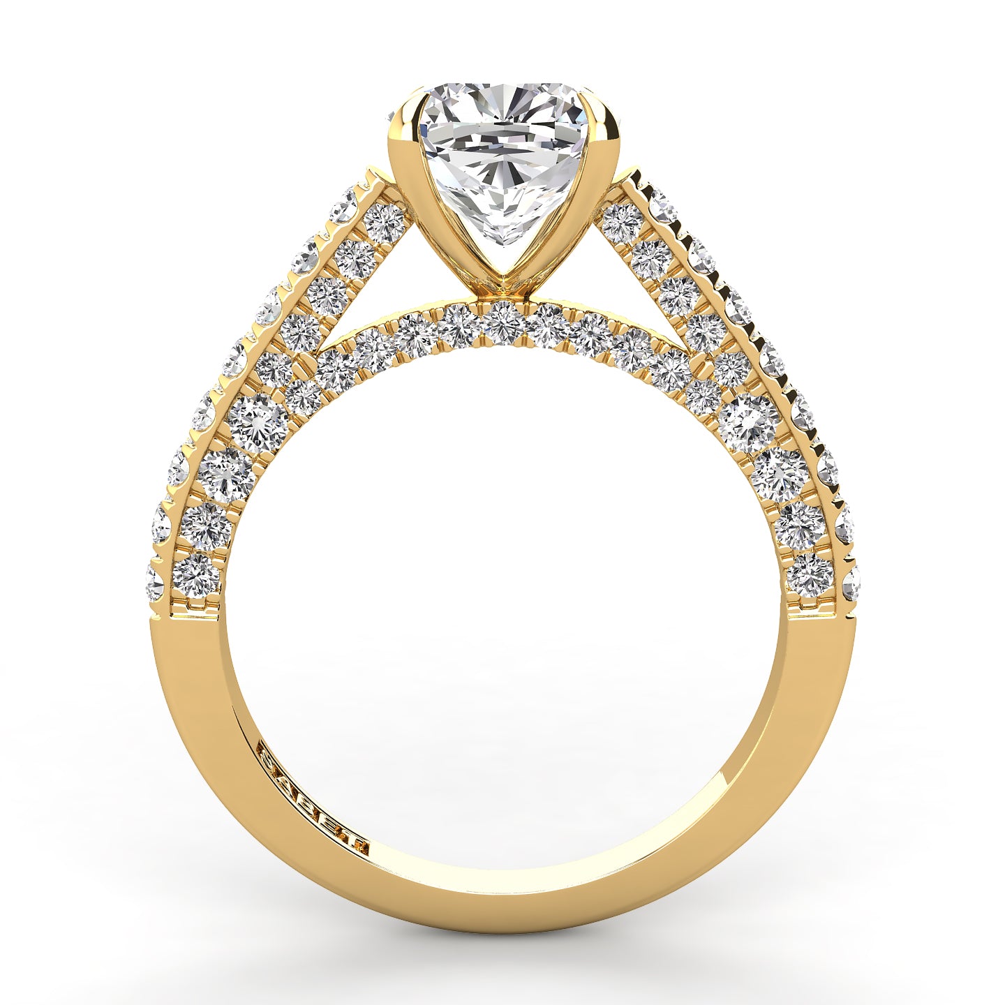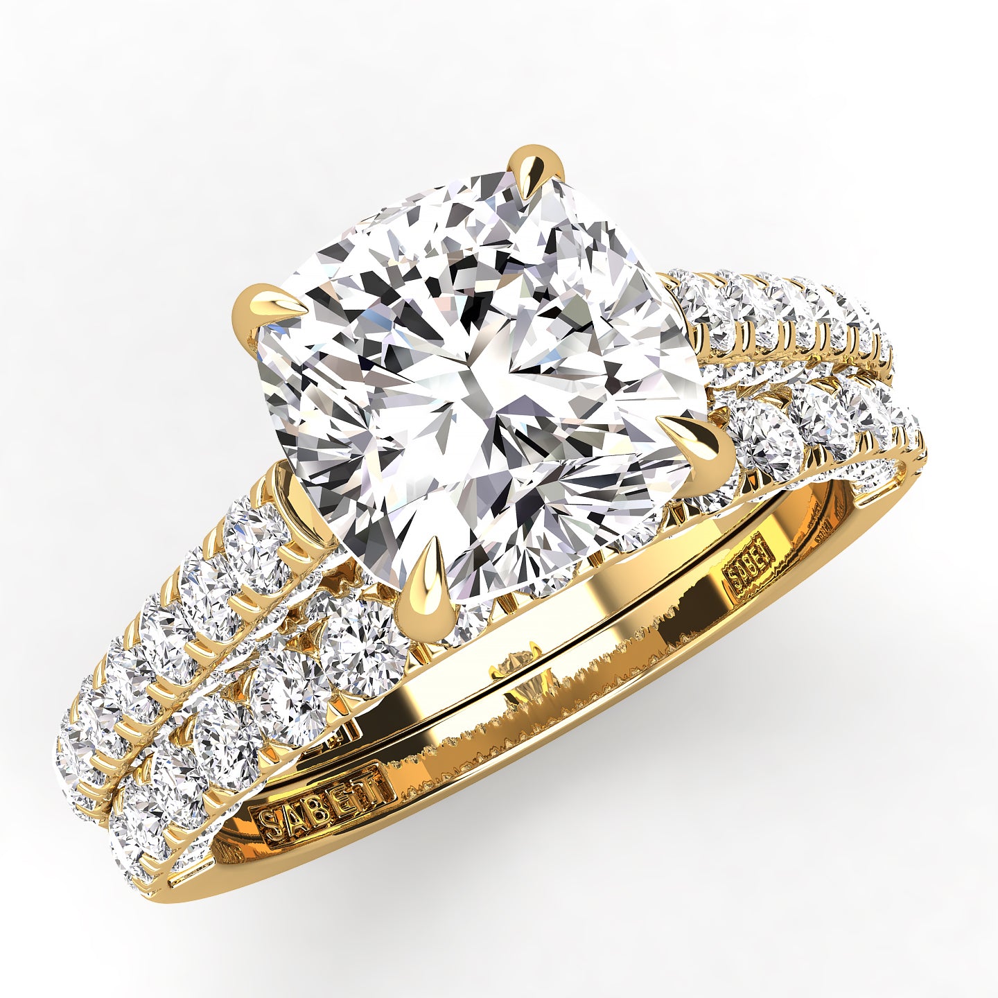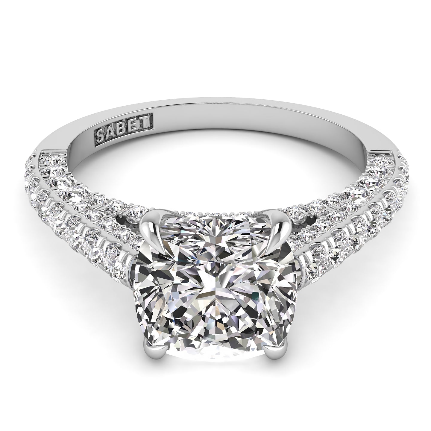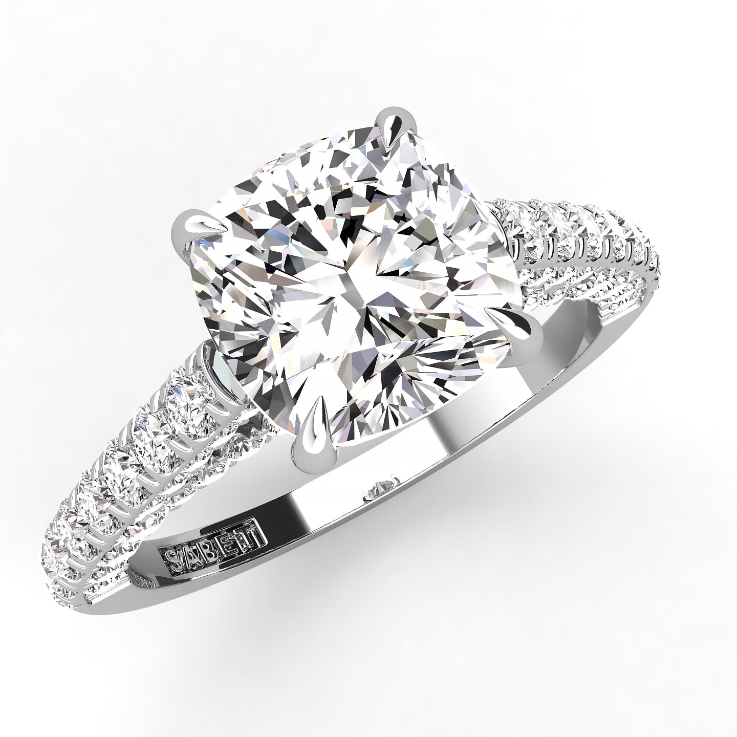 Discover our stunning cushion-cut engagement ring featuring a pave setting, three-sided diamond accents, diamond bridge detailing, and secure four-prong design. Perfectly crafted for timeless elegance and maximum sparkle, this ring is ideal for a luxurious engagement. Shop our cushion pave engagement rings with exquisite craftsmanship and breathtaking brilliance.