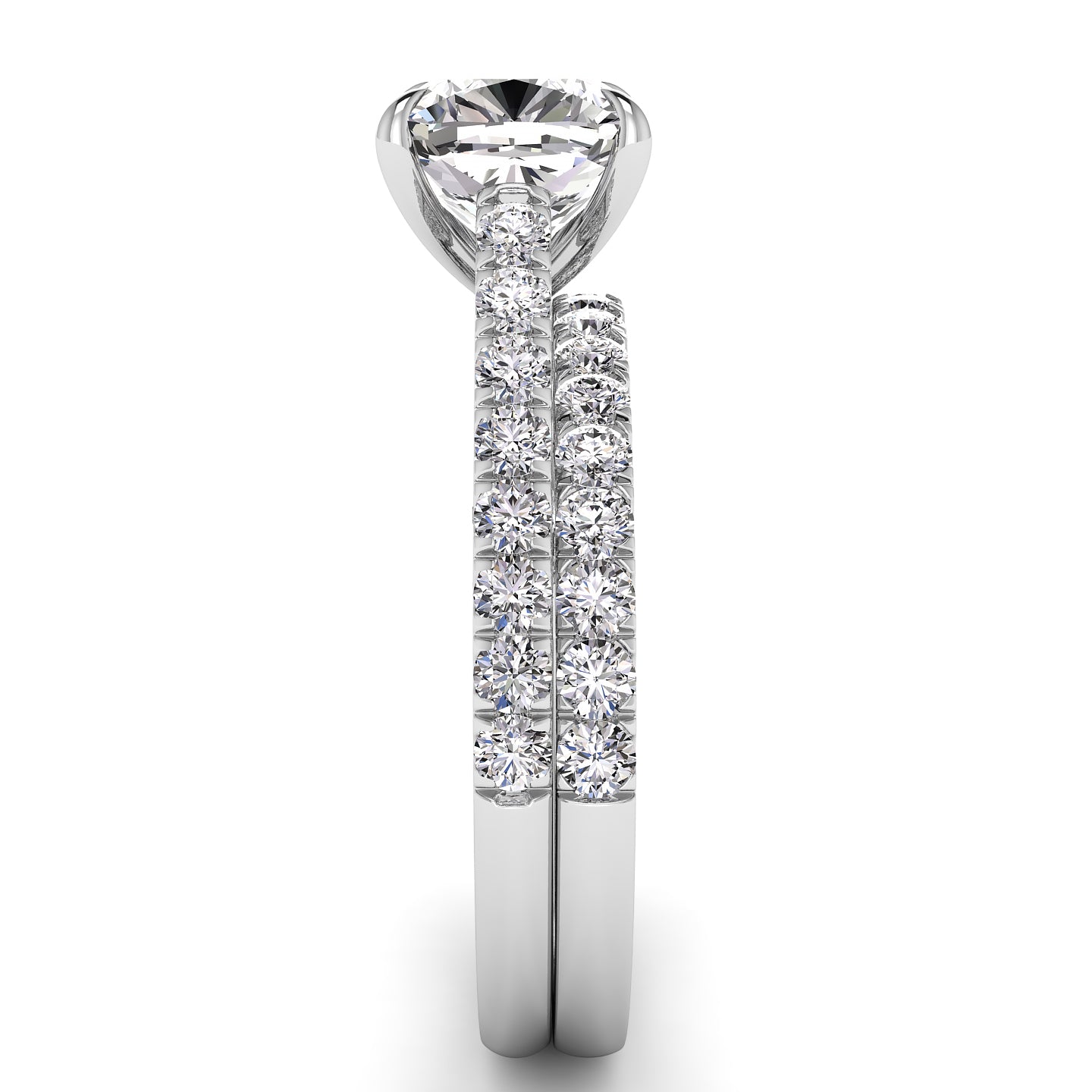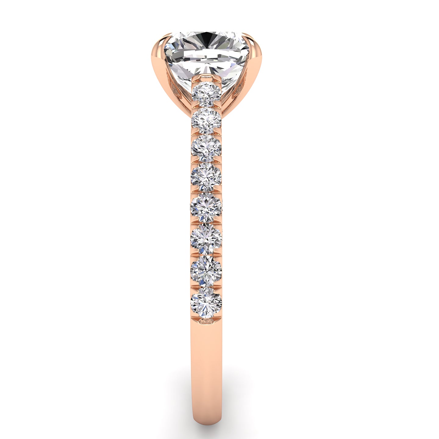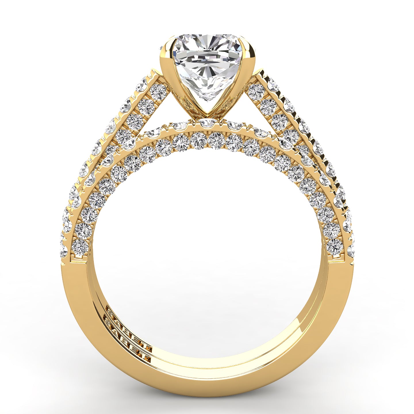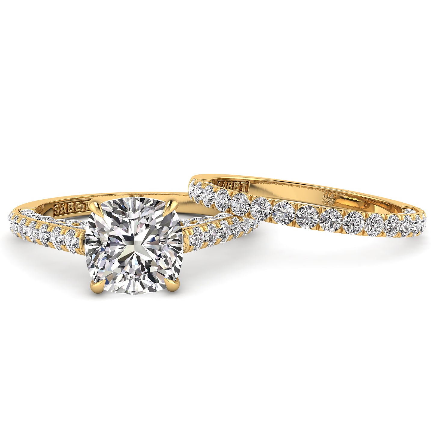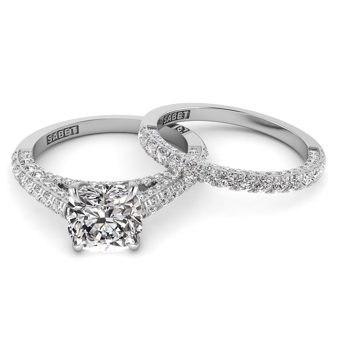 Discover our stunning cushion-cut engagement ring featuring a pave setting, three-sided diamond accents, diamond bridge detailing, and secure four-prong design. Perfectly crafted for timeless elegance and maximum sparkle, this ring is ideal for a luxurious engagement. Shop our cushion pave engagement rings with exquisite craftsmanship and breathtaking brilliance.