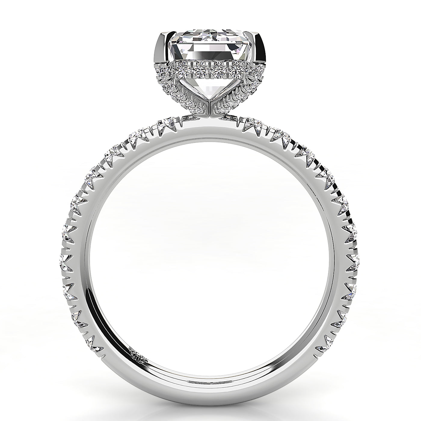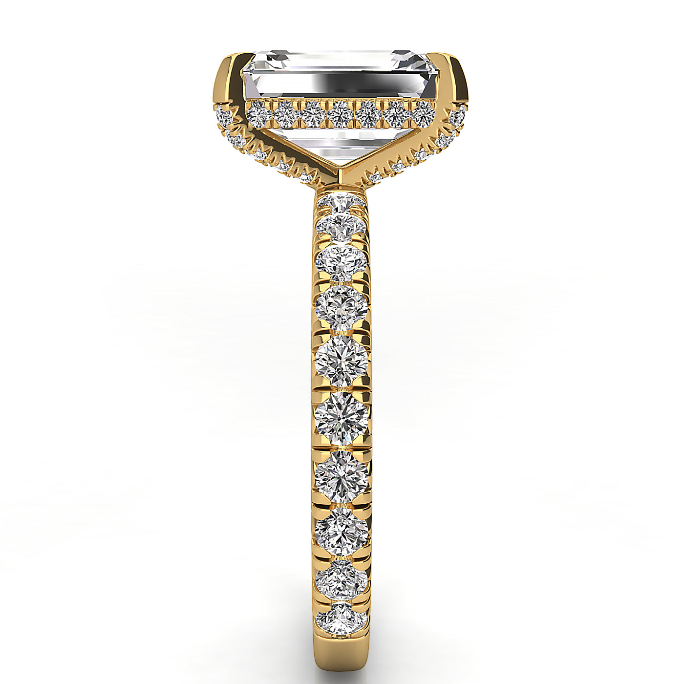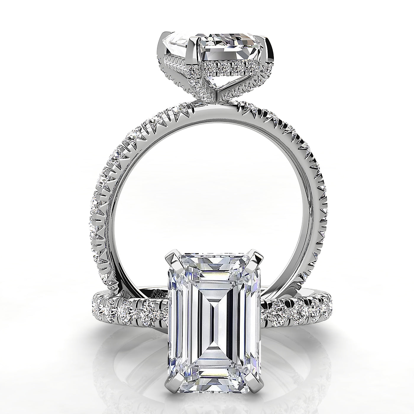 Emerald engagement ring featuring a rounded body and tab prongs, showcasing a stunning emerald-cut stone for a classic and elegant look. Perfect for those seeking a unique emerald engagement ring with secure prong settings and smooth, rounded band design. Ideal for timeless style and lasting durability.