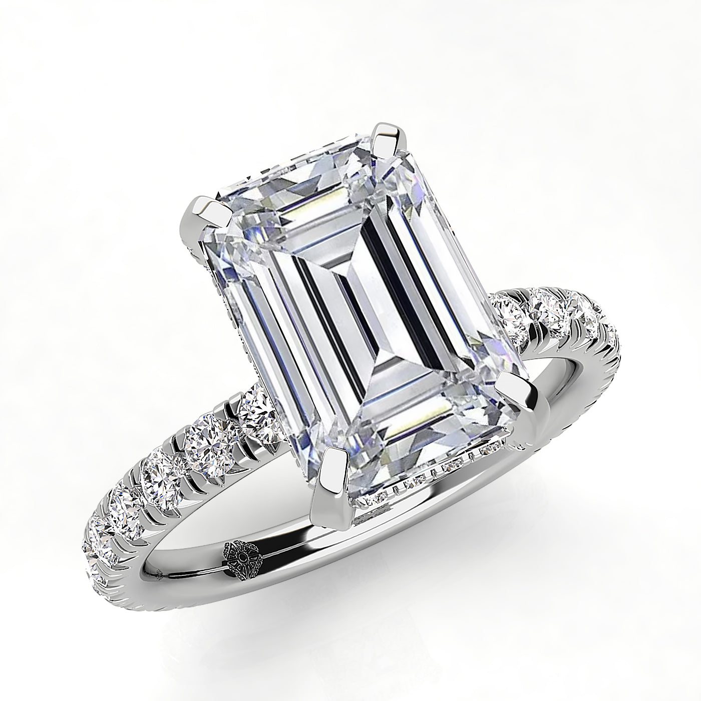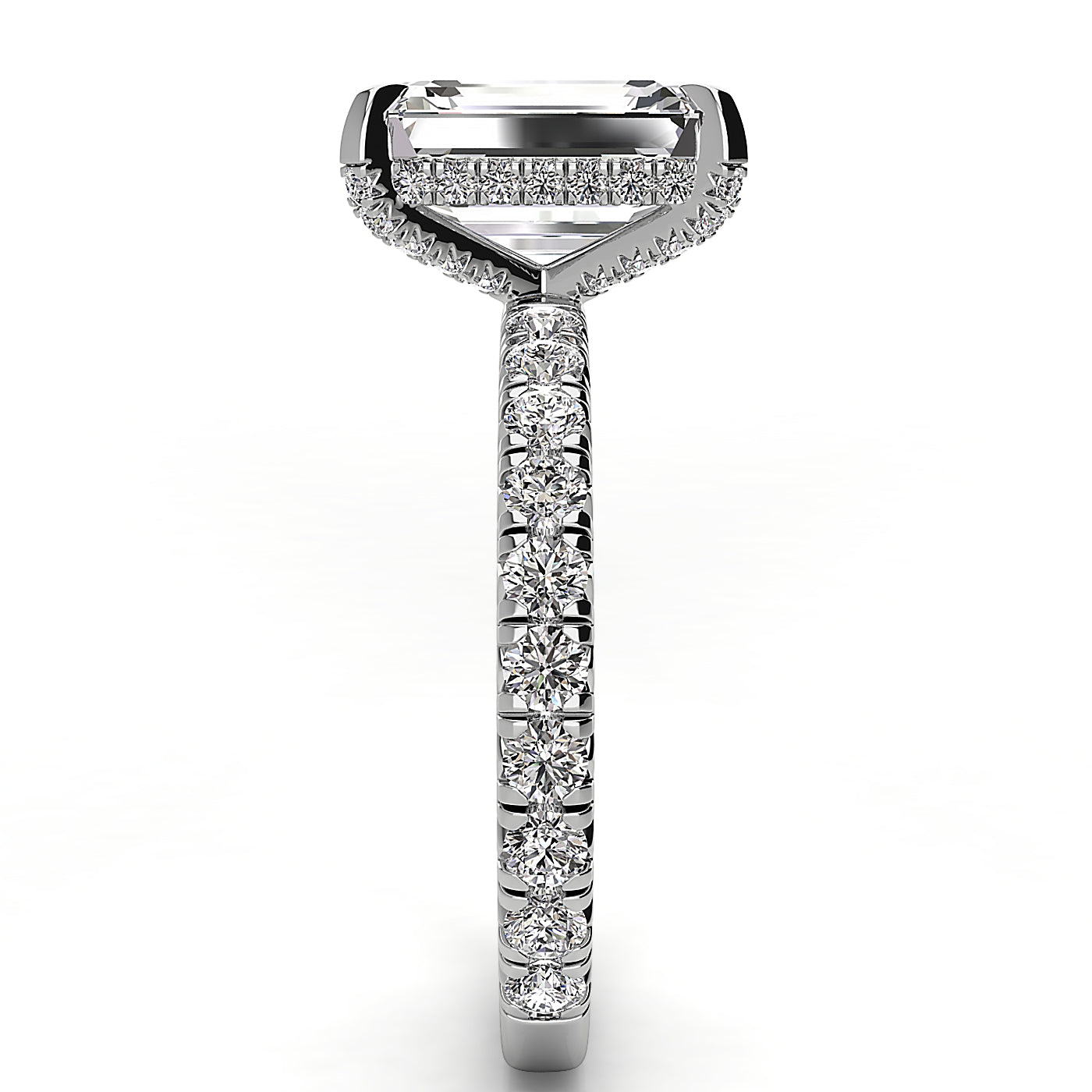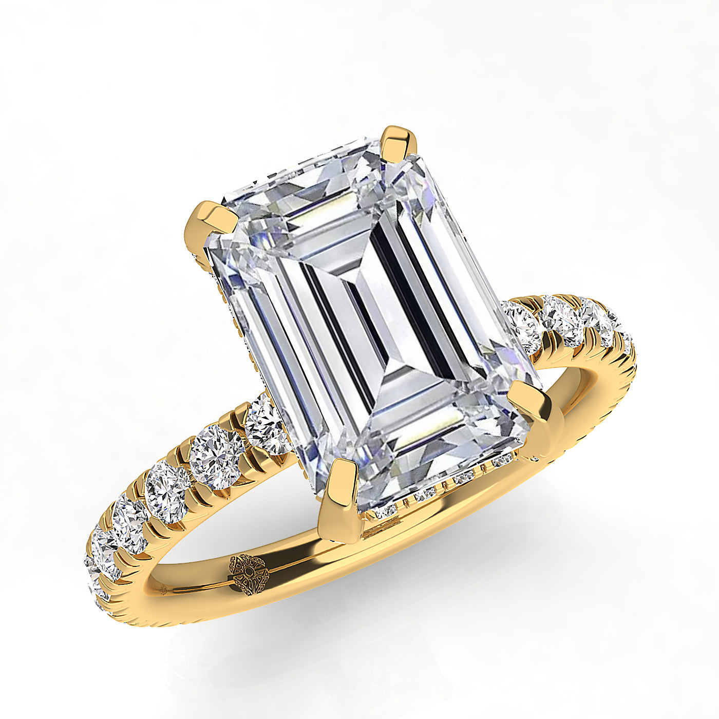Emerald engagement ring featuring a rounded body and tab prongs, showcasing a stunning emerald-cut stone for a classic and elegant look. Perfect for those seeking a unique emerald engagement ring with secure prong settings and smooth, rounded band design. Ideal for timeless style and lasting durability.