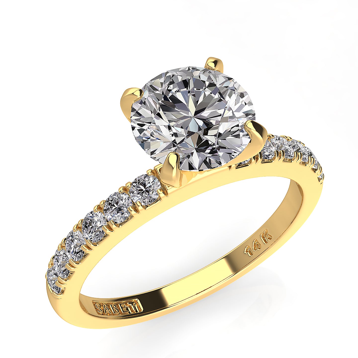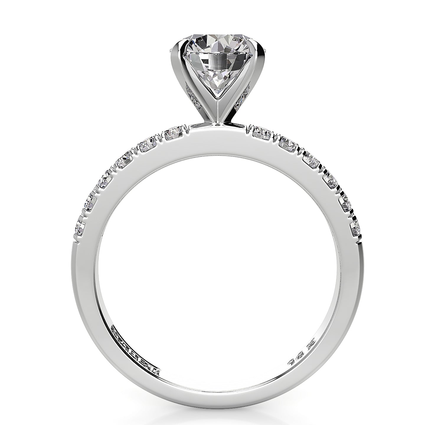 Discover our exquisite engagement ring featuring a stunning round center stone in a secure four-prong setting, elegantly accented by a shimmering pavé band. Perfectly crafted for timeless elegance and brilliant sparkle, this round cut pavé engagement ring combines classic style with modern sophistication, making it an ideal choice for your forever commitment.